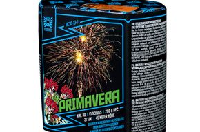 Absolut beliebte 13 Schuss Batterie im Kaliber 30 mm mit goldenen Blinkschweif-Aufstieg und einem riesigen Bukett aus grünen Blinkern und roten Blütensternen.
